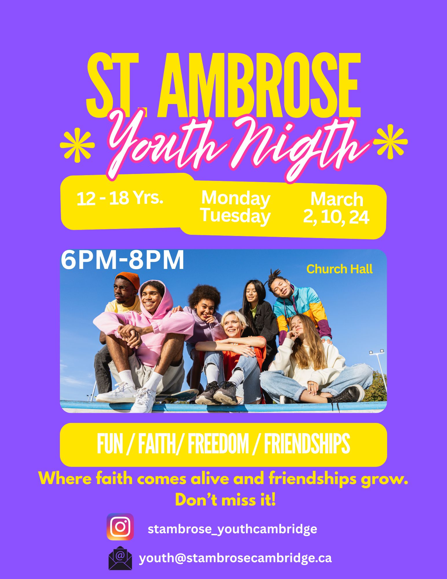 Snacks provided. Please enter through the side door of the church on the parking lot side. For information please email Rose, coordinator of Youth Ministry at youth@stambrosecambridge.ca